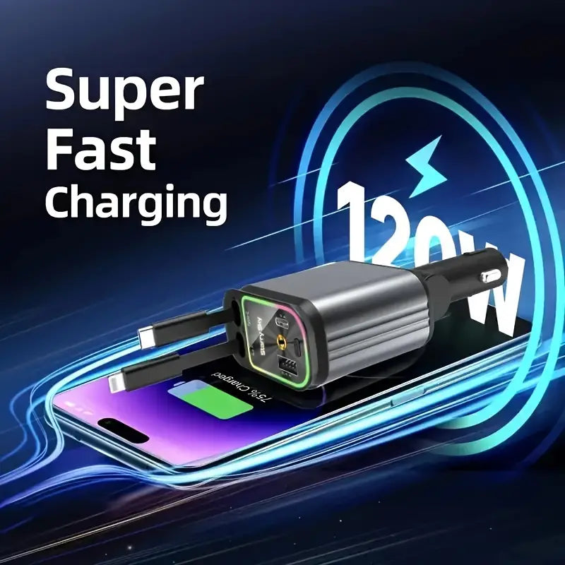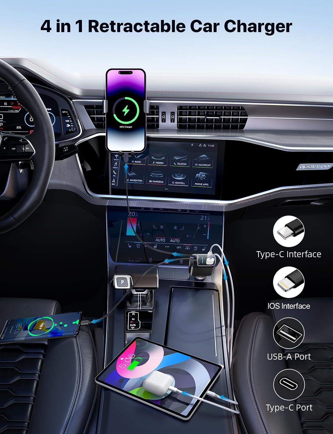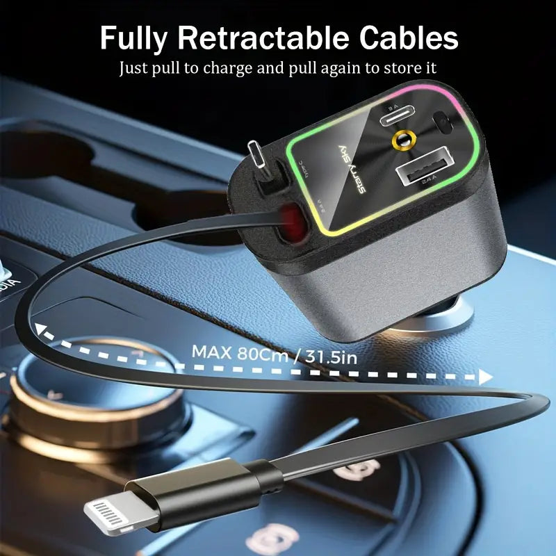 • Flexible Retractable Design: The retractable car charger pulls out the cable within the 80cm range, and it retracts back inside automatically for storage, keeping it clean and tidy without cable entanglement, and facilitating convenient control and usage.