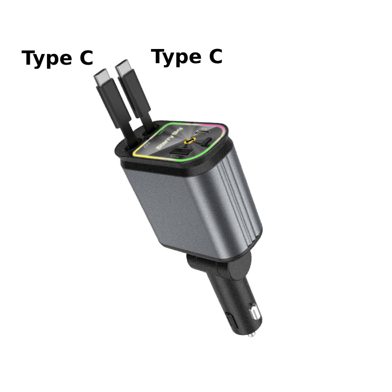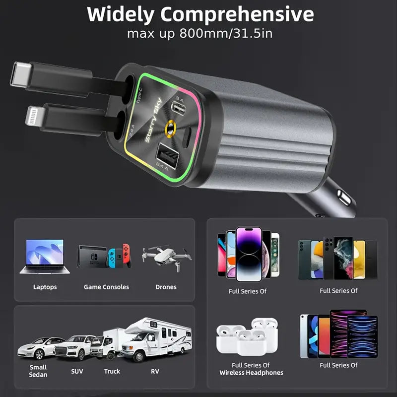 This Star Lights car phone charger comes with retractable Type-C and ios charging cables, each stretching up to 80cm (31.5 inches). Stretching for a short distance and then release to automatically bounce back to its original position. This design ensures that your car remains clutter-free and that the cables do not get tangled, providing a smooth and convenient charging experience.