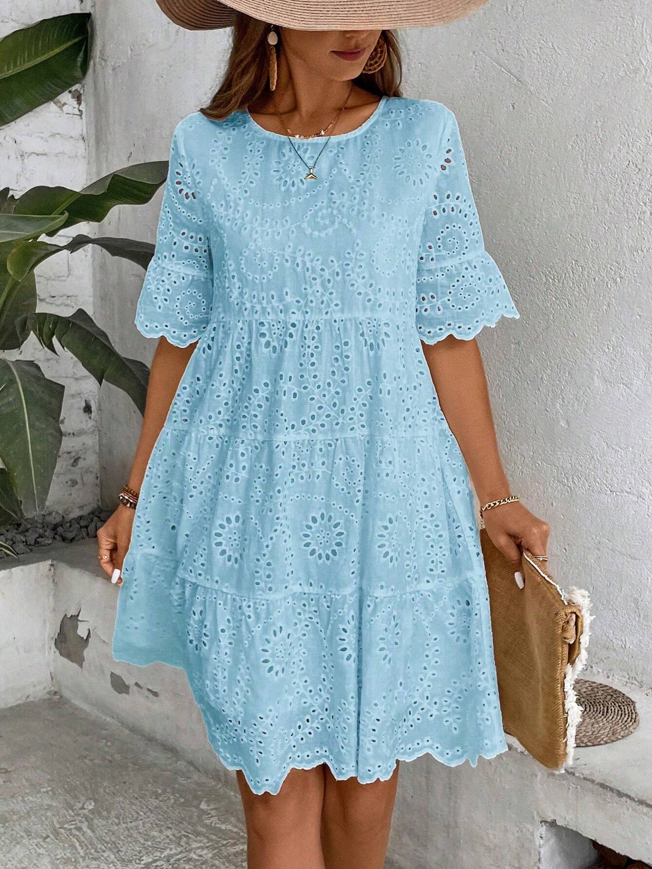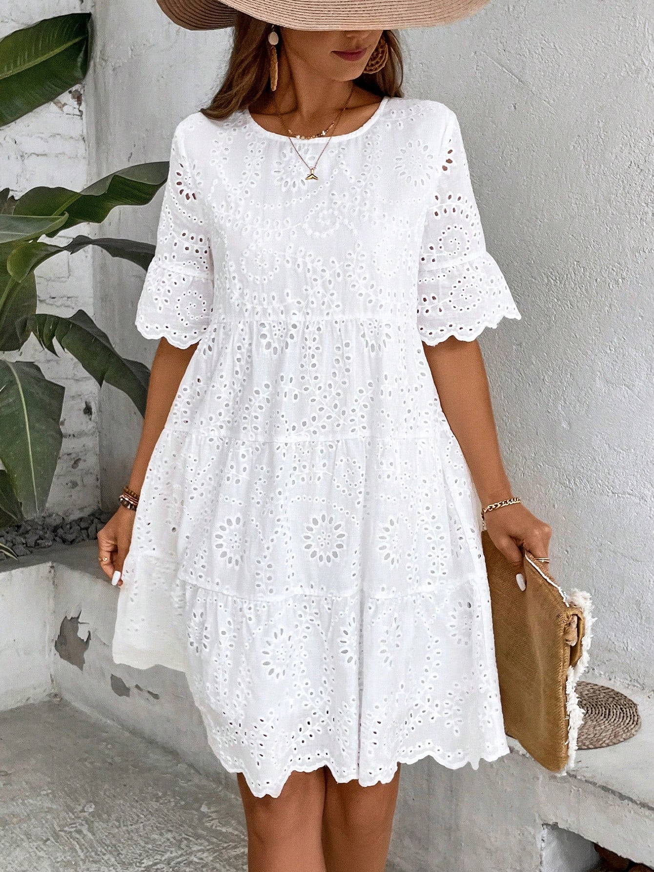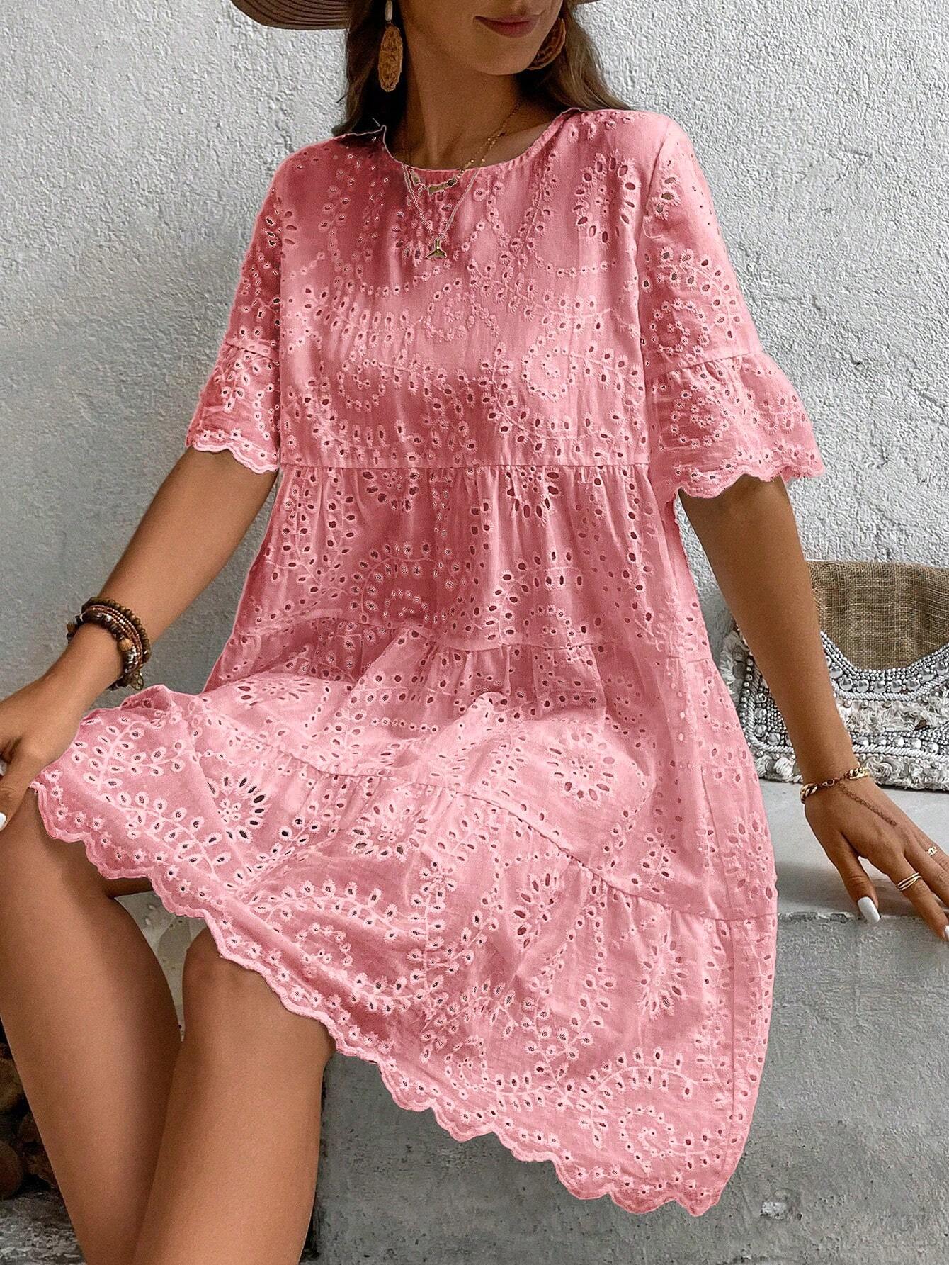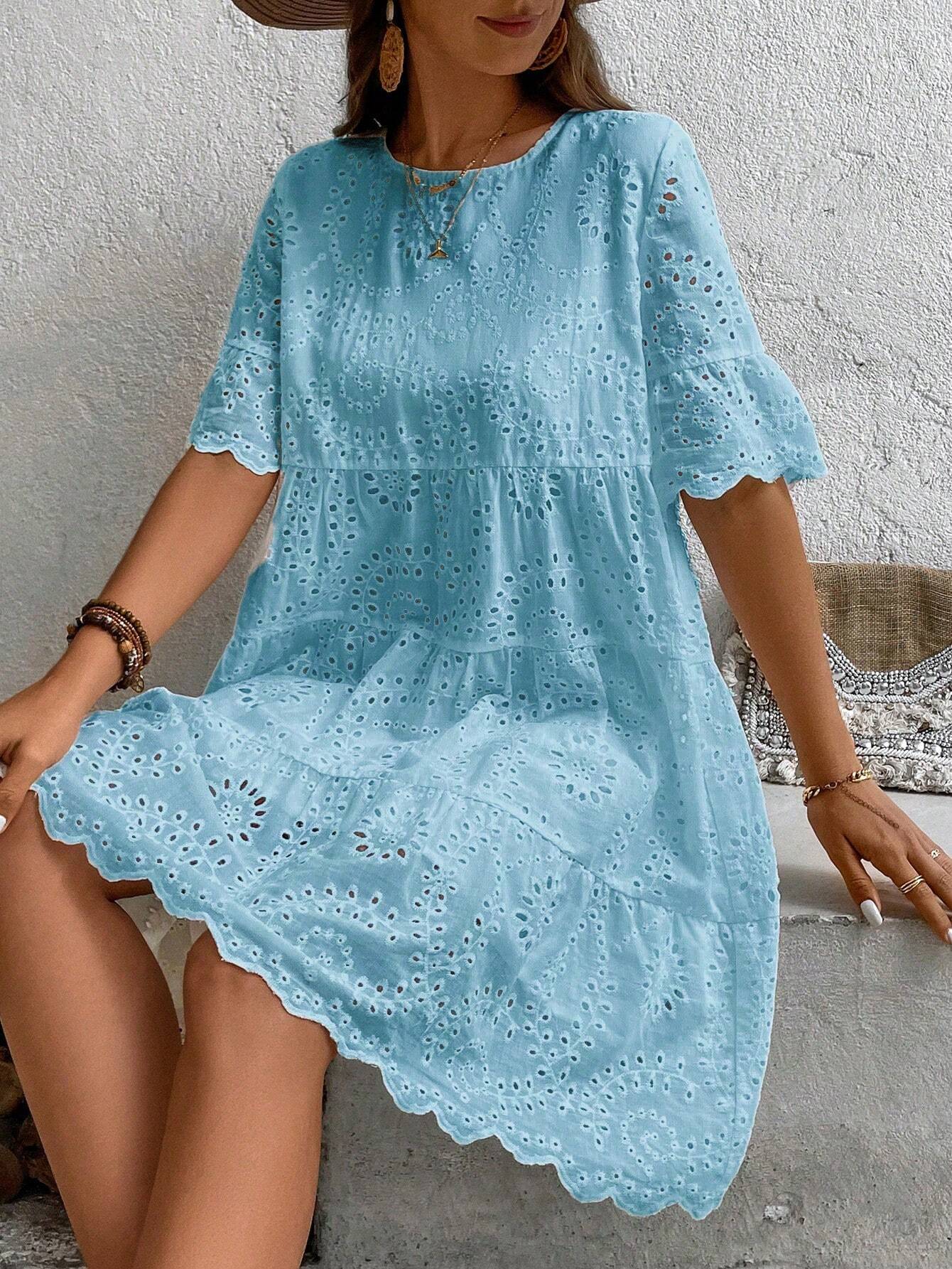 Embrace effortless elegance with the EMERY ROSE Boho Eyelet Smock Dress, a charming blend of vintage-inspired details and modern comfort. Designed with delicate eyelet embroidery, a graceful Peter Pan collar, and a ruffled hem, this dress exudes femininity and sophistication. The scallop half sleeves add a touch of romantic flair, while the loose, high-waist smock silhouette ensures a flattering and breezy fit. Crafted from 100% cotton woven fabric, it's lightweight, breathable, and perfect for spring and summer days. Whether you're heading to a casual brunch, a picnic, or a vacation getaway, this dress is a must-have for a chic yet relaxed look.