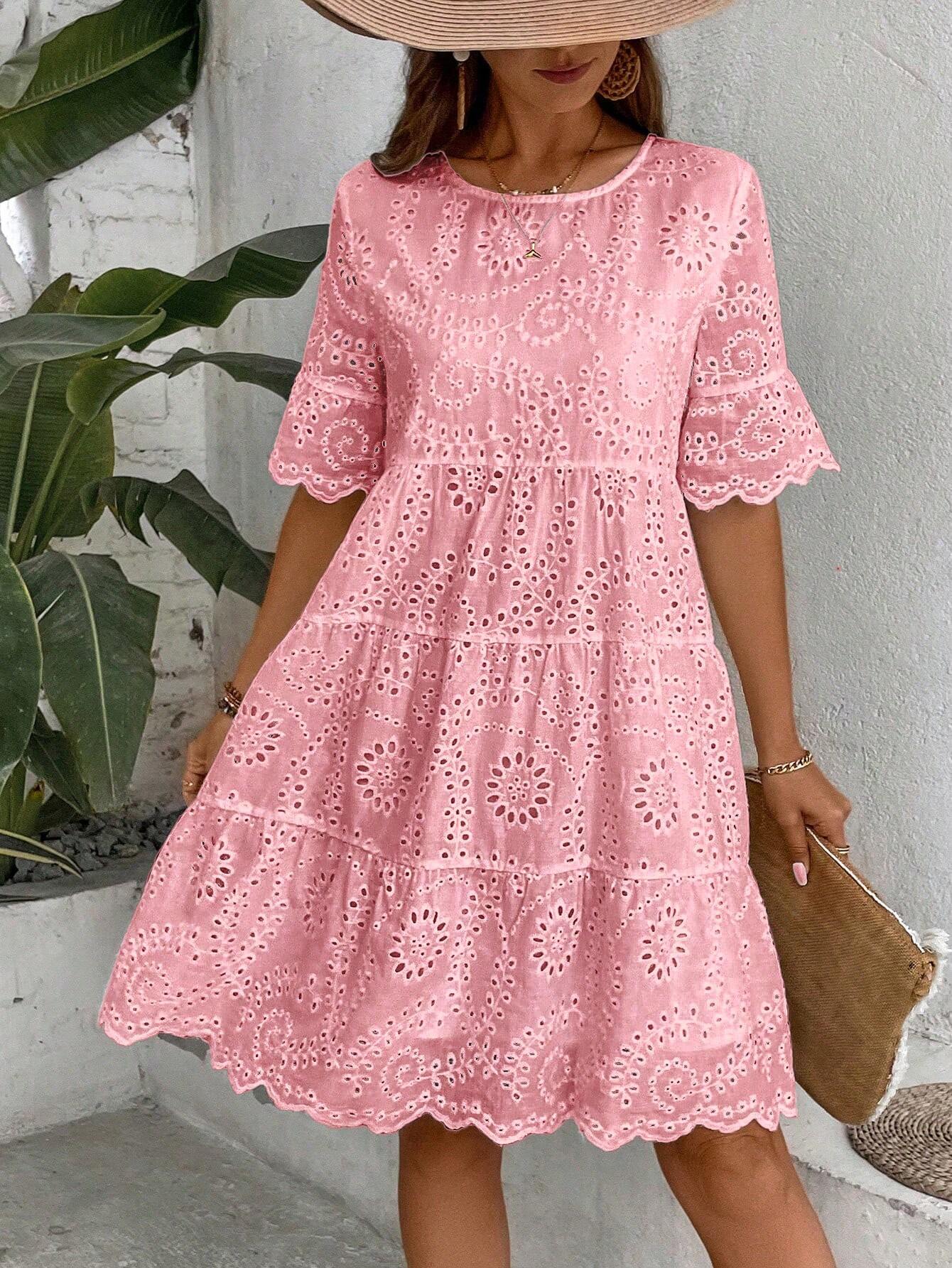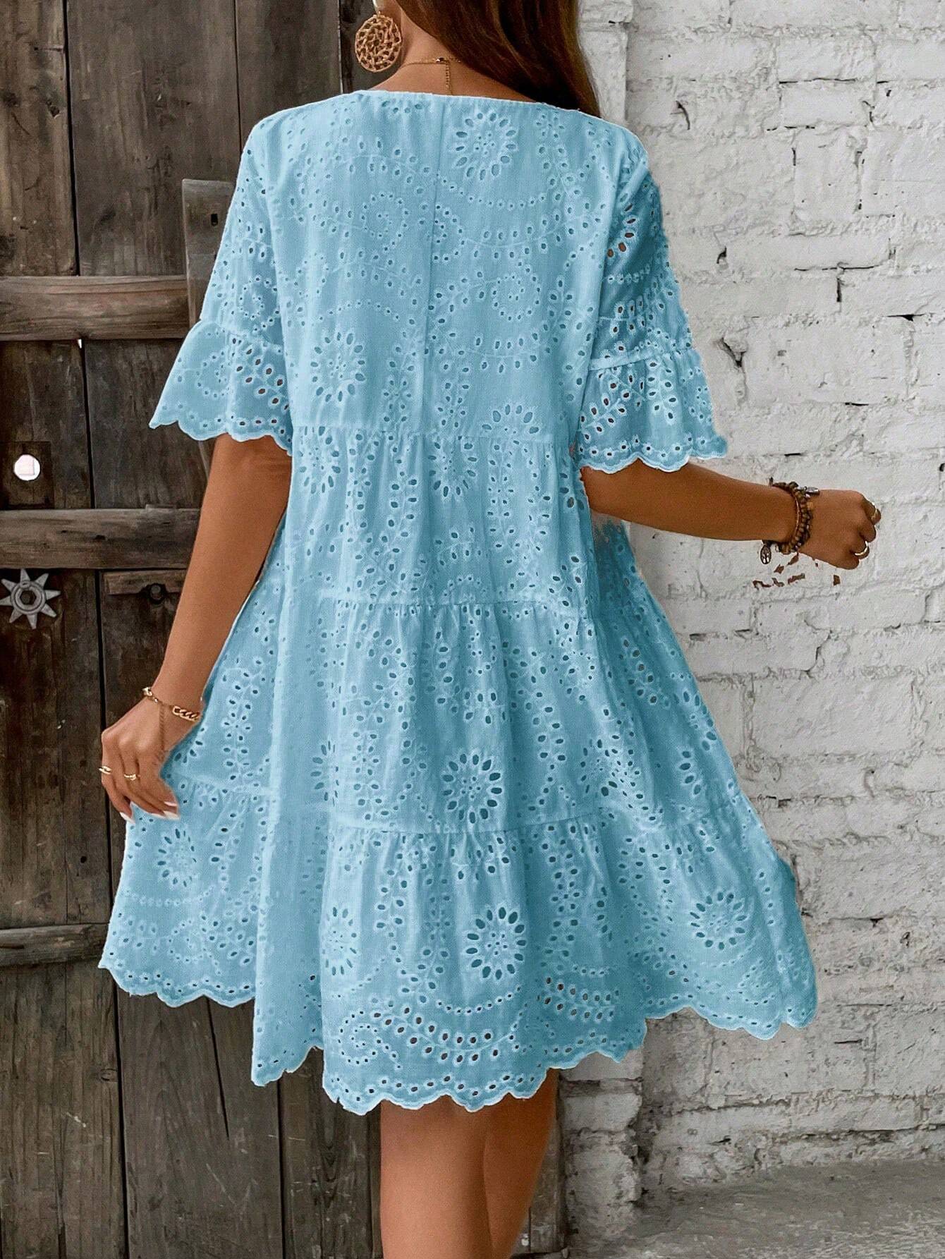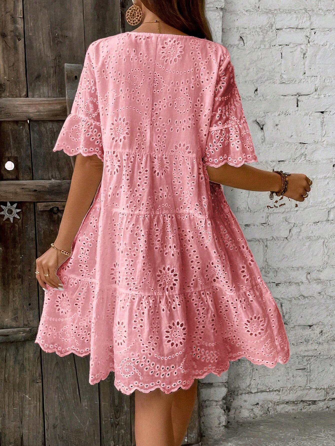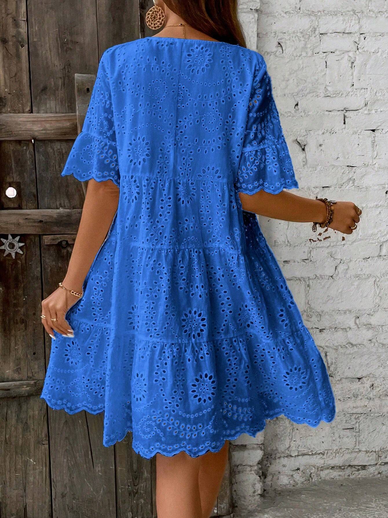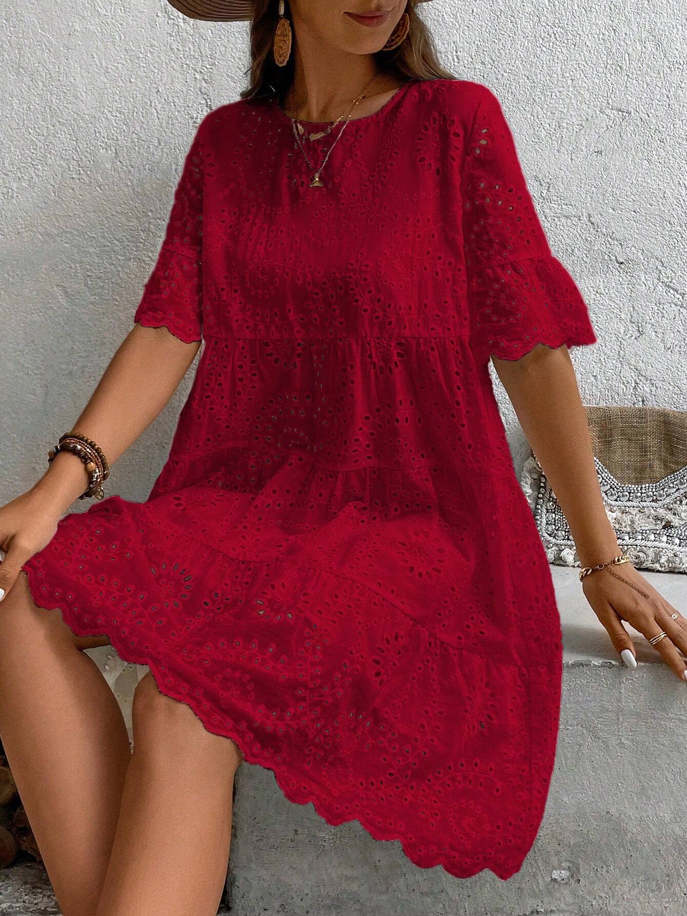 Embrace effortless elegance with the EMERY ROSE Boho Eyelet Smock Dress, a charming blend of vintage-inspired details and modern comfort. Designed with delicate eyelet embroidery, a graceful Peter Pan collar, and a ruffled hem, this dress exudes femininity and sophistication. The scallop half sleeves add a touch of romantic flair, while the loose, high-waist smock silhouette ensures a flattering and breezy fit. Crafted from 100% cotton woven fabric, it's lightweight, breathable, and perfect for spring and summer days. Whether you're heading to a casual brunch, a picnic, or a vacation getaway, this dress is a must-have for a chic yet relaxed look.