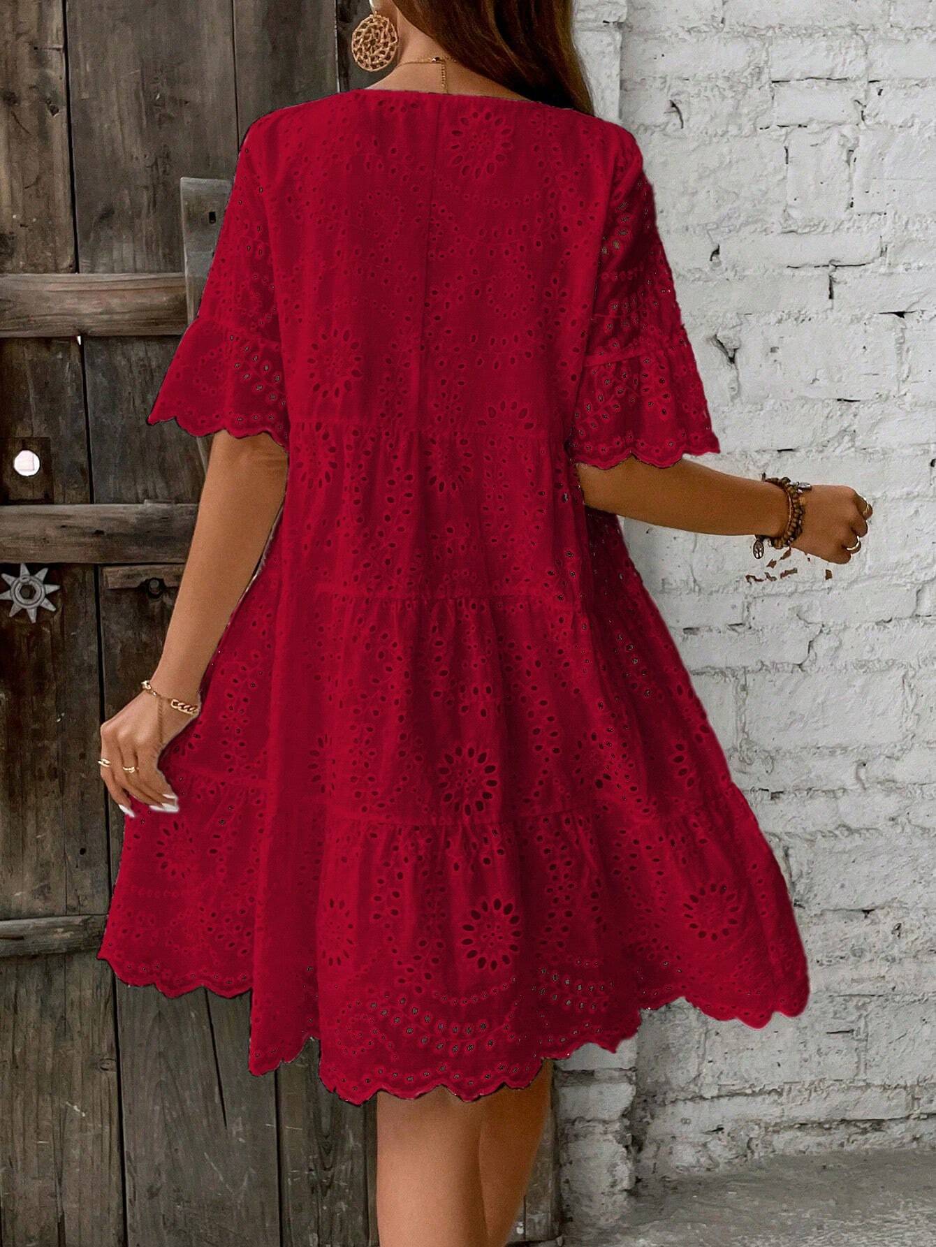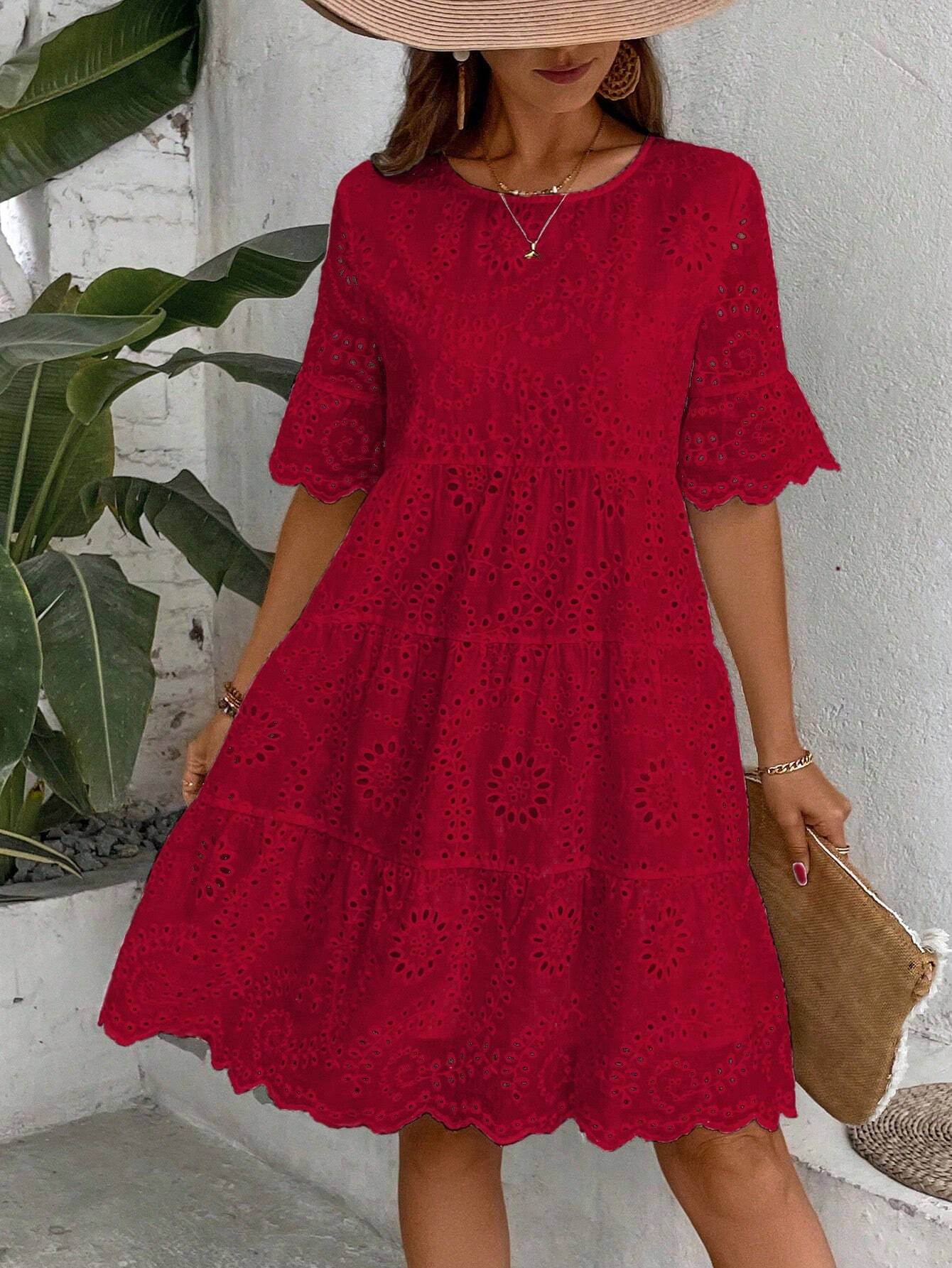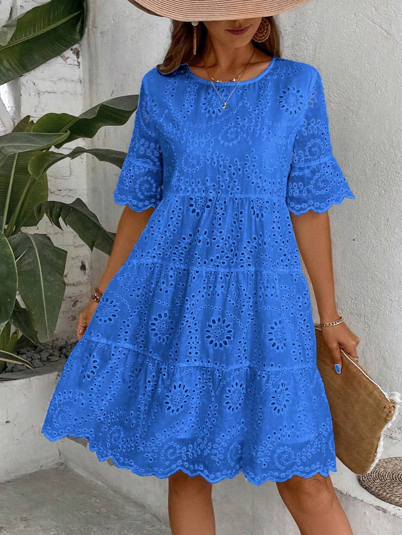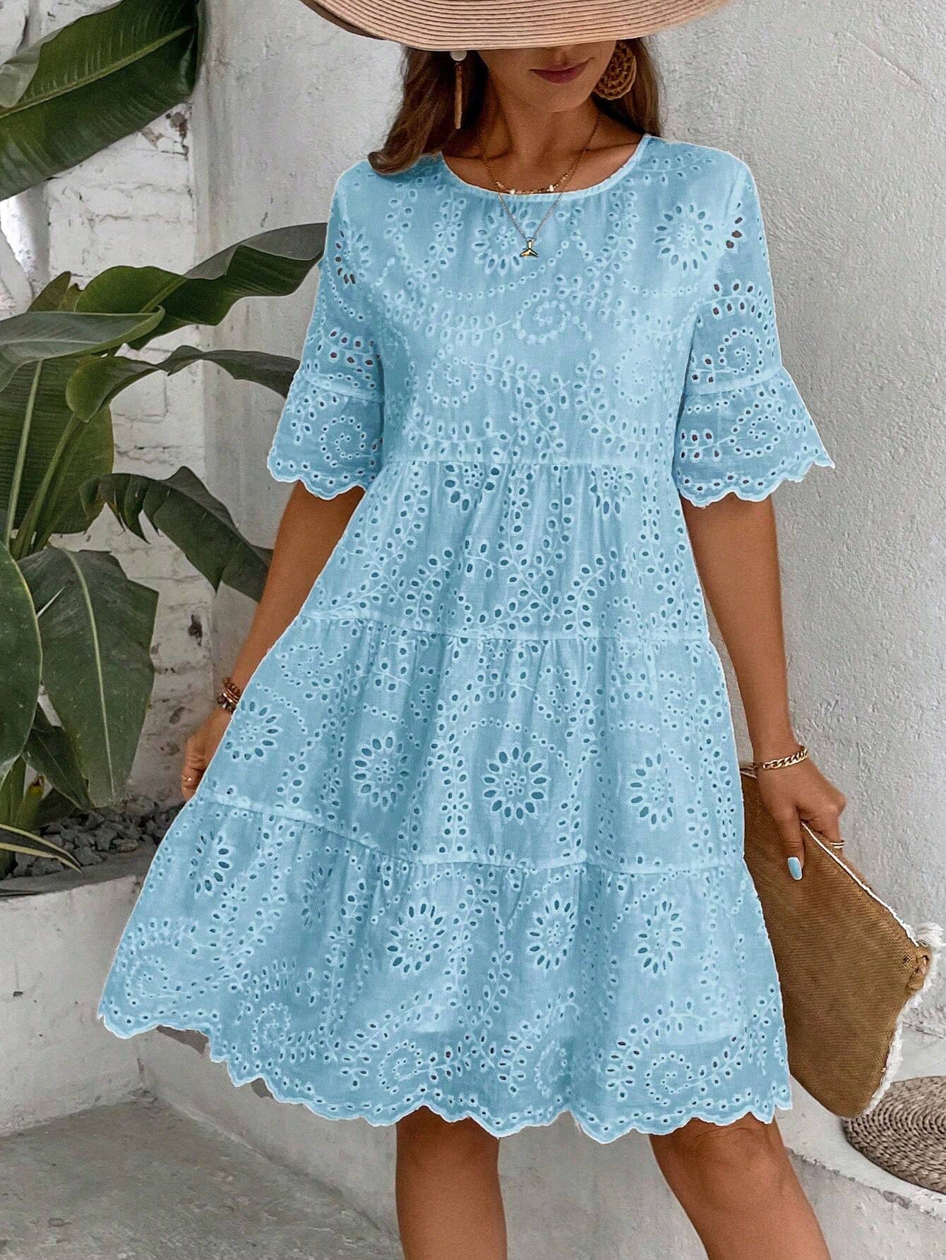 Embrace effortless elegance with the EMERY ROSE Boho Eyelet Smock Dress, a charming blend of vintage-inspired details and modern comfort. Designed with delicate eyelet embroidery, a graceful Peter Pan collar, and a ruffled hem, this dress exudes femininity and sophistication. The scallop half sleeves add a touch of romantic flair, while the loose, high-waist smock silhouette ensures a flattering and breezy fit. Crafted from 100% cotton woven fabric, it's lightweight, breathable, and perfect for spring and summer days. Whether you're heading to a casual brunch, a picnic, or a vacation getaway, this dress is a must-have for a chic yet relaxed look.