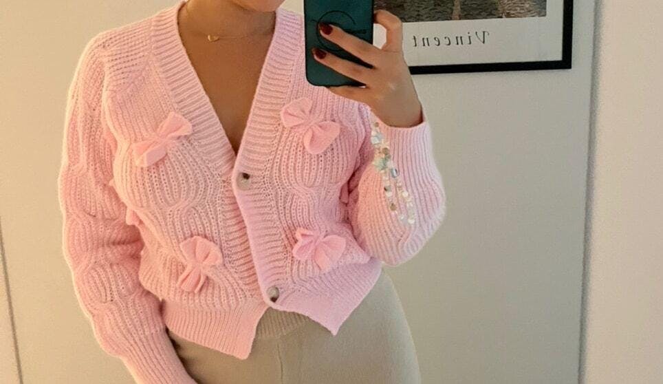 Love this cardigan!! It’s thick but not heavy, soft and stretchy. Love the shade of pink. Really cute design.