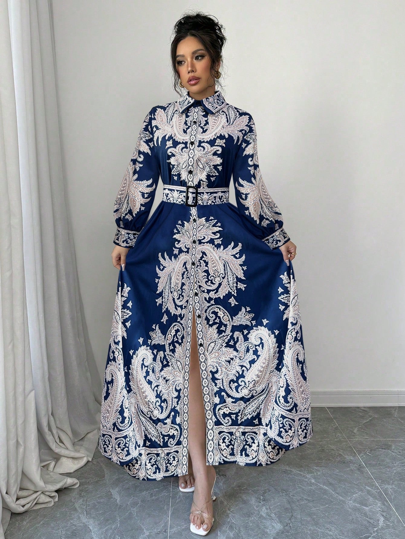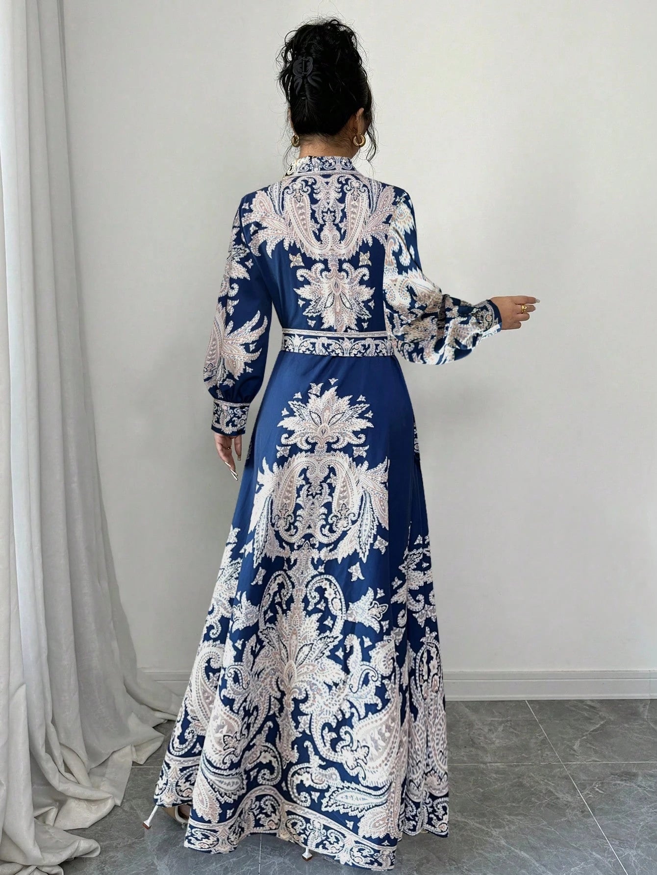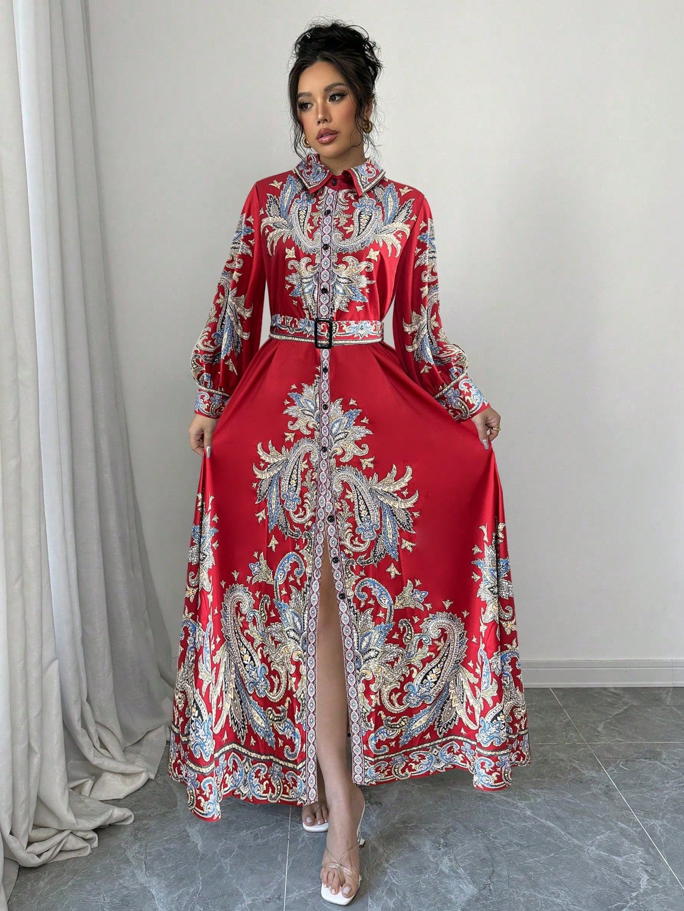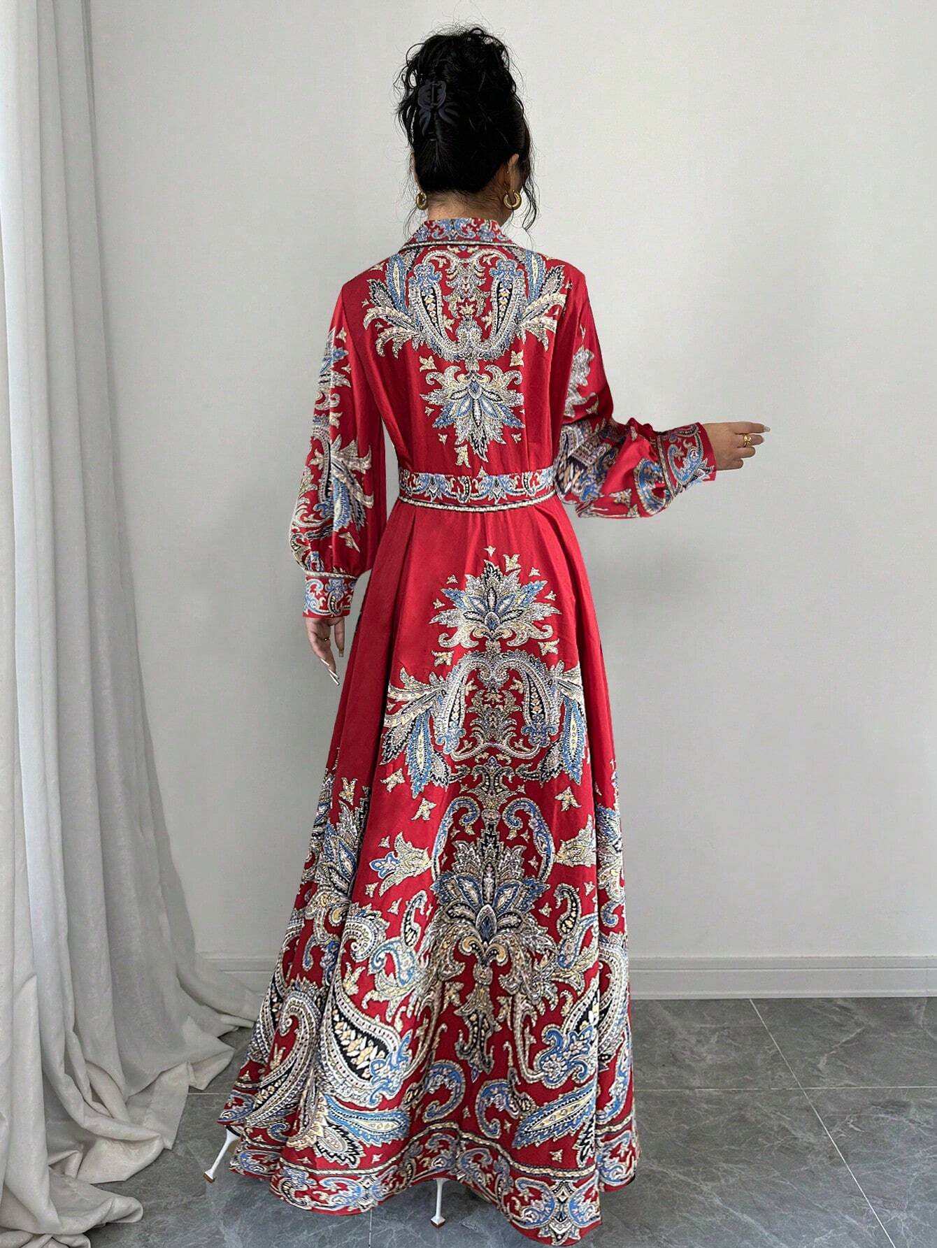 Elevate your wardrobe with the Vintage Floral Print Elegant Maxi Dress, a timeless piece designed for effortless sophistication. This dress features a stunning all-over floral and plant print in vibrant multicolor hues, making it perfect for any season. The elegant shirt dress design is enhanced by a classic collared neckline, button-down front, and a waist-cinching belt for a flattering silhouette. The bishop sleeves add a touch of vintage charm, while the high-waist and flared hem create a graceful, flowing look. Crafted from a non-stretch woven fabric with a blend of 97% polyester and 3% elastane, this dress ensures comfort while maintaining a polished appearance.